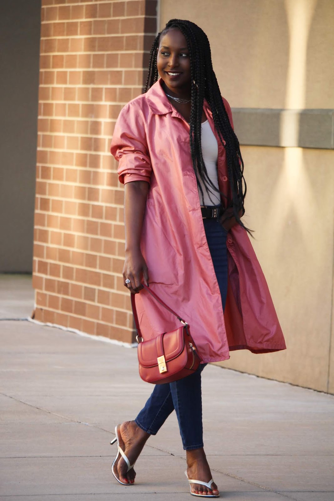 I like a light throw-on you can style in different ways. This raincoat is so light for Summer days yet warm enough for Fall nights. And I still laugh at these Yeezy inspired sandals that I found at a thrift store for less than $5.